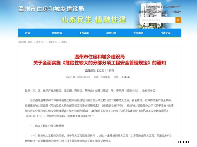 為加強(qiáng)房屋建筑和市政基礎(chǔ)設(shè)施工程中危險(xiǎn)性較大的分部分項(xiàng)工程(以下簡稱危大工程)安全管理,有效防范生產(chǎn)安全事故,根據(jù)住房城鄉(xiāng)建設(shè)部《危險(xiǎn)性較大的分部分項(xiàng)工程安全管理規(guī)定》(住建部令第37號(hào))、住房城鄉(xiāng)建設(shè)部辦公廳《關(guān)于實(shí)施<危險(xiǎn)性較大的分部分項(xiàng)工程安全管理規(guī)定>有關(guān)問題的通知》(建辦質(zhì)〔2018〕31號(hào))和浙江省建設(shè)廳《建筑施工安全管理規(guī)范》(DB33/1116),并結(jié)合我市實(shí)際,現(xiàn)就有關(guān)事項(xiàng)通知如下: